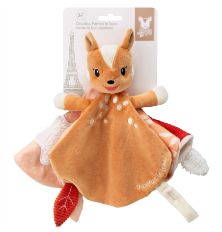 <p>El <strong>Doudou de Fanfan el Ciervo</strong> es el compañero perfecto para tu bebé, brindando seguridad, confort y <strong>estimulación sensorial</strong> desde el juego hasta la hora de dormir.</p> <p>Ligero y fácil de sujetar, cuenta con colores brillantes, texturas suaves y un práctico clip de Velcro para sujetar el chupete.</p> <p>Su diseño ergonómico fomenta la <strong>motricidad fina</strong> y el <strong>desarrollo sensorial</strong>, convirtiéndolo en un accesorio esencial para el bienestar del bebé.</p> <p>Ideal para acompañarlo en todas sus aventuras, este doudou ofrece cariño y tranquilidad en todo momento. </p>