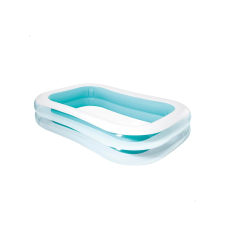 <p>Disfruta de divertidas tardes en familia con la <strong>piscina hinchable familiar</strong> rectangular.</p> <p>Con medidas de <strong>262x175x56 cm</strong> y capacidad para <strong>770 litros de agua</strong>, esta piscina está diseñada para que puedas vigilar a los más pequeños mientras todos disfrutáis juntos.</p> <p>Fabricada en vinilo resistente de <strong>0,30 mm de grosor</strong> y con un atractivo diseño en azul transparente, es perfecta para disfrutar al aire libre.</p> <p>Se recomienda llenarla hasta una altura de 36 cm, garantizando así un baño seguro y confortable para hasta 3 niños.</p> <p>Con un<strong> peso de carga de 10,6 kg</strong>, es fácil de transportar y almacenar, ideal para crear momentos memorables en tu hogar.</p>