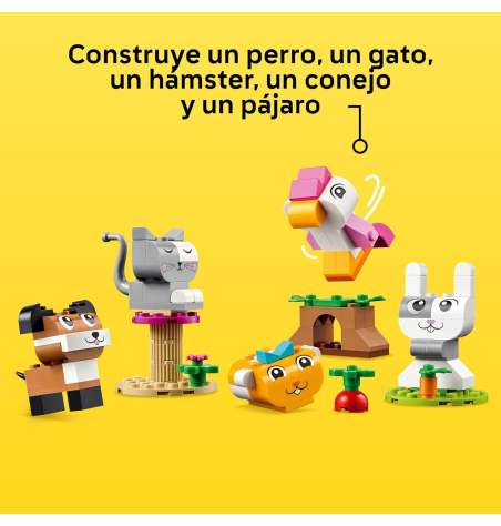 <p><strong>Tu peque construye y personaliza un perro, un gato, un hámster, un pájaro y un conejo usando ladrillos, ojos, bocas, colores y </strong></p> <p><strong>accesorios con este Lego.</strong></p>