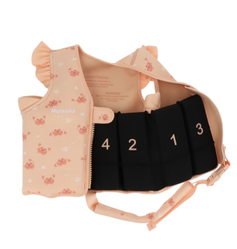Con 8 compartimentos y cada uno de ellos con 3 piezas que proporcionan la flotabilidad alrededor del torso y que se pueden ir ajustando a medida que van aprendiendo.