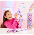 Abre las cuatro bolsas sorpresa para encontrar ropa y accesorios, como una falda, una diadema, unas gafas de sol, un par de zapatos, un peine con