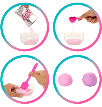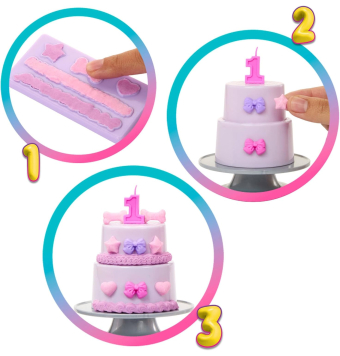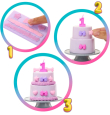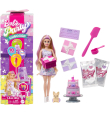 Incluye: 1 muñeca de moda Barbie, 1 vestido, 1 par de zapatos, 1 minimascota, 1 compuesto de masa, 1 pastel, 1 cuchara, 1 espátula, 1 molde y 1