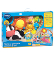 Panel interactivo con un gran botón luminoso con forma de sol y con sensor de movimiento que activa melodías y 3 formas diferentes para descubrir los colores, formas y animales.