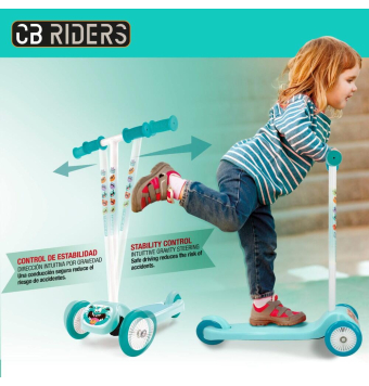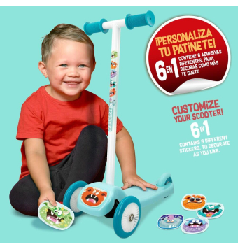 Patinete con divertidas ilustraciones de animalitos en el manillar y con pegatina frontal personalizable.