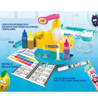 Contenido: 1 unidad Marker Lab, 3 frascos de tinta perfumada de 29 ml cada uno, rojo, amarillo, azul, 14 juegos para hacer marcadores (14 puntas cónicas, bidones, filtros, tapones), 2 tubos para medir la tinta, 2 hojas de etiquetas, 1 pinza, 1 guía para hacer colores