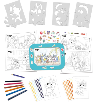 Set creativo de Bluey con 3 actividades. Pintar por números, crear 2 figuras 3D para decorar y dibujar personajes de la serie.
