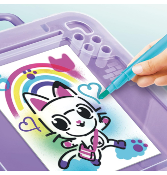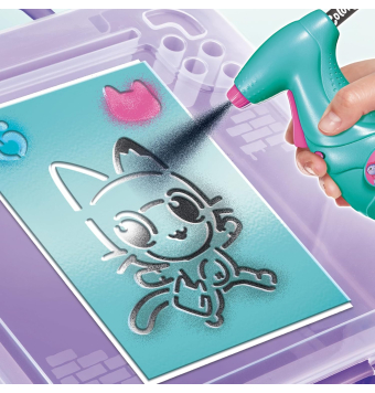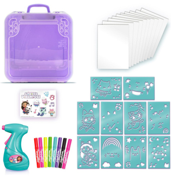 CONTENIDO: 1 estuche, 1 spray electrónico, 8 rotuladores, 10 hojas de plantillas originales, 1 hoja de pegatinas con los colores de Gabby, 10 hojas de dibujo en blanco y 1 folleto de instrucciones