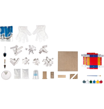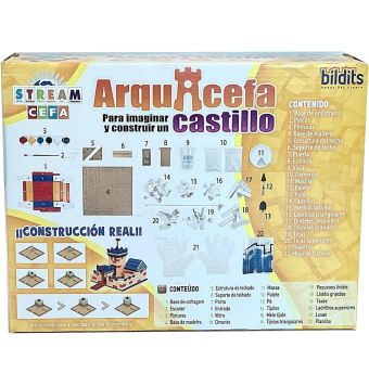 El set incluye mini ladrillos, cemento, estructura del tejado, tejas, pintura, mini herramientas y un libro guía con instrucciones detalladas para construir y decorar el castillo