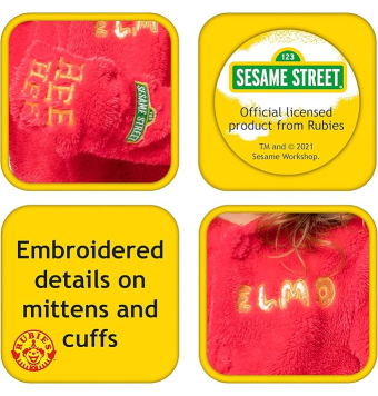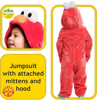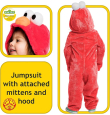 El disfraz incluye mono rojo suave con capucha. Logotipo de Elmo en el pecho y el brazo, con ojos y nariz en la capucha.