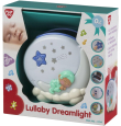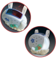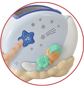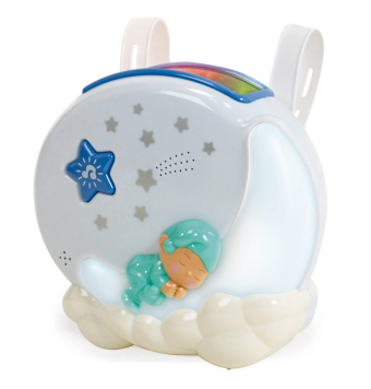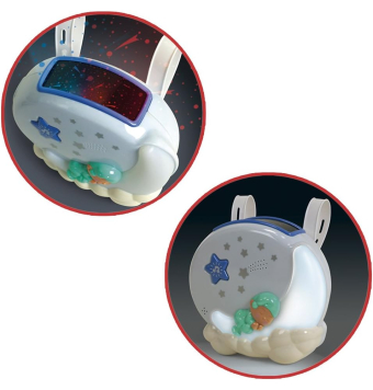 Luz nocturna que combina luces y sonidos; proyector emite luces de colores verdes, azules y rojas, mientras que la luz de la luna es blanca.