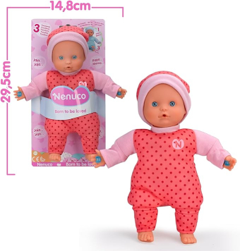 Nenuco blandito con funciones, cuando aprietas sus manos o sus pies el muñeco hace sonidos de bebé. Además, puede meterse el dedo en la boca como los bebés de verdad. Hace sonidos de risa, lloros y hasta dice papa/mama. Viene con un pijama rosa con gorrito. Su juego fomenta la sociabilidad y su desarrollo sensorial.