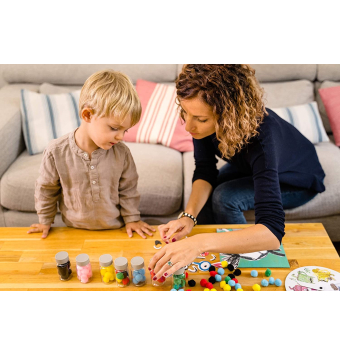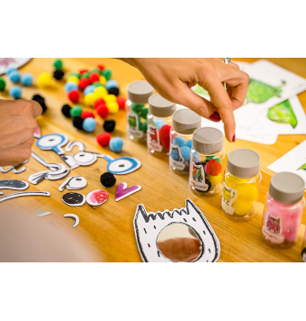 - 7 frascos con etiquetas autoadhesivas y 102 pompones (17 de cada color): clasificar las emociones.