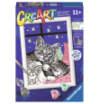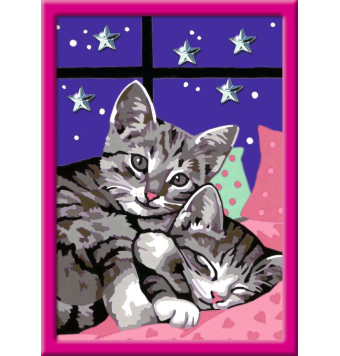 CreArt Dulces Gatitos. Juego creativo para niños y niñas pintando mediante los números y líneas de colores que rodean las casillas. Contiene un kit con todo lo que necesitas para pintar y pegar gemas a los gatos y un marco para colgar tu trabajo una vez que el trabajo está terminado. Podrá ir creando, paso a paso, un cuadro perfecto. ¡Pintar nunca ha sido tan fácil!