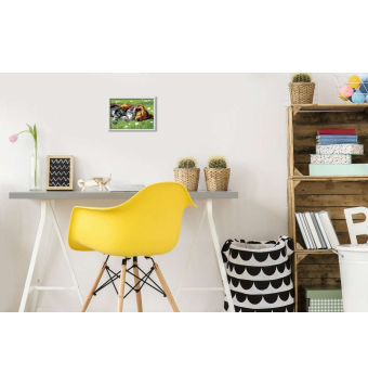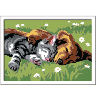 CreArt de cachorros de perro Teckel marrón y gato gris durmiendo en el prado. Juego creativo para niños y niñas pintando mediante los números y líneas de colores que rodean las casillas. Contiene un kit con todo lo que necesitas para pintar los animales y un marco para colgar tu trabajo una vez que el trabajo está terminado. Podrá ir creando, paso a paso, un cuadro perfecto. ¡Pintar nunca ha sido tan fácil!