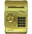 Hucha automática con forma de caja fuerte de color oro edición limitada. Esta hucha se abre con una contraseña numérica modificable. Tiene sonidos y luces. La puerta chirria cuando se abre. Tiene un orificio para insertar monedas y billetes.