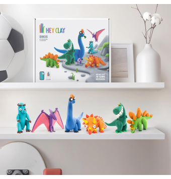 Hey Clay Dinosaurios. Set de plastilina para 6 personajes: Tiranosaurio, Pterodáctilo, Estegosaurio, Braquiosaurio, Paquicefalosaurio, Tricerátops.