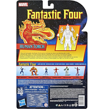 Figura articulada retro de la Antorcha Humana de 15 cm, basada en el personaje del universo Marvel Comics de la colección Legends Series Fantastic Four (Los Cuatro Fantásticos). Dispone de numerosos puntos de articulación y 4 accesorios.