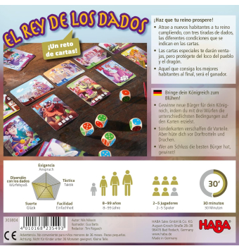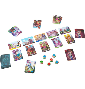 Contiene: 6 dados, 65 cartas (15 cartas de lugar, 10 cartas de castigo y 40 cartas de habitantes), instrucciones del juego.