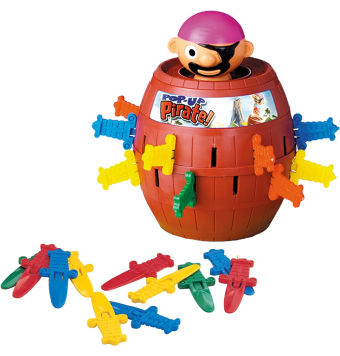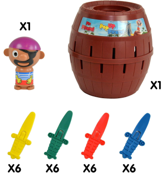 Introduce las espadas de tu color en cualquiera de los agujeros del barril del pirata. Si el agujero no es el correcto, el pirata salta y tú