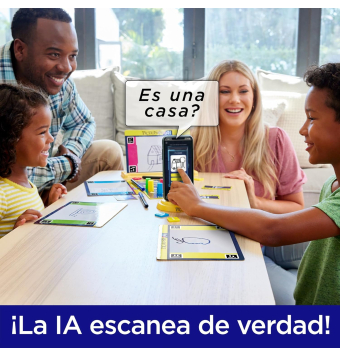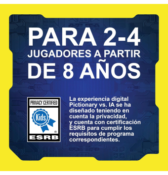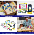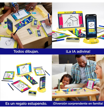 Contenidos: Soporte para teléfono, soporte para pizarra para tinta borrable, tablero de juego, 112 cartas de pistas, 4 figuras, 4 rotuladores de tinta al agua, 4 pizarras para la tinta borrable, 8 fichas