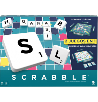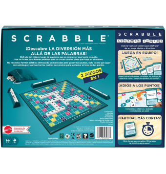 • Dos juegos en uno! Disfruta del clásico juego Scrabble que ya conoces y que tanto te gusta...… o dale la vuelta al tablero de doble cara y