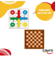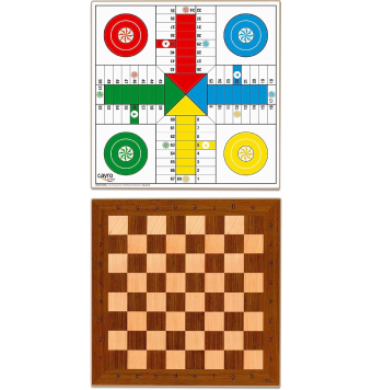El tablero de parchís-ajedrez, de madera, tiene unas medidas 40x40 cm. Está fabricado con madera de primera calidad y cuenta con un