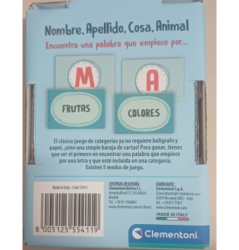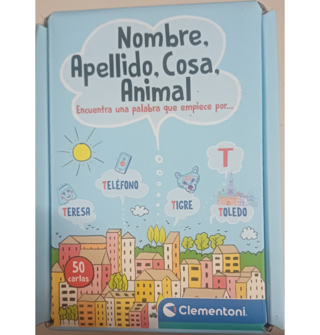 Una baraja de cartas que contienen por un lado una categoría (Nombres, Cosas y Ciudades) y por el otro una letra del alfabeto. Un juego de velocidad en el que, después de voltear 2 cartas, los jugadores compiten por ser los primeros en decir una palabra que empiece por la letra del alfabeto indicada