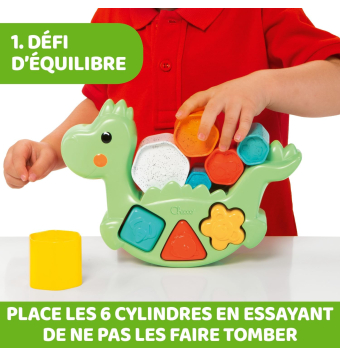 Tu dinosaurio lino necesita ayuda para mantener el equilibrio debes colocar los 6 cilindros de diferentes tamaños sobre su espalda