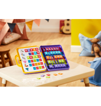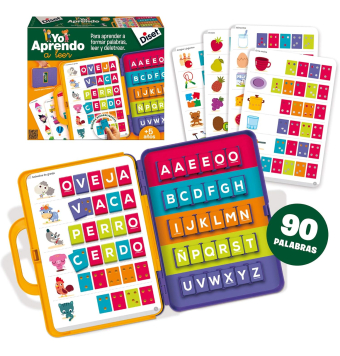 Contenido Yo Aprendo a leer : 1 maletín; 15 láminas para formar 90 palabras y 90 fichas con todas las letras del abecedario.