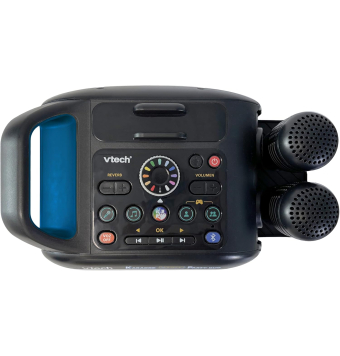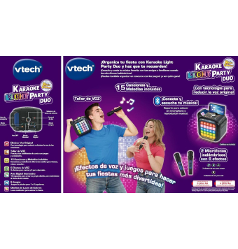 Reproduce tus listas vía Bluetooth, disfruta de 10 melodías y 5 canciones integradas o apóyate en el soporte para móvil y leer letras desde la pantalla. Canta a la vez con los 2 micrófonos inalámbricos.