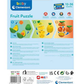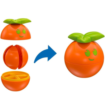 volver a poner. La piña está formada por elementos que se pueden apilar. La naranja se abre y esconde 4 gajos para quitar y poner