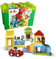 Incluye diferentes ladrillos de colores, un coche con ruedas que se mueven, ventanas, flores, bloques de números 1-2-3, 2 figuras DUPLO de un niño y una niña, además de un bonito perrito de juguete.