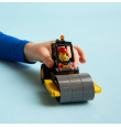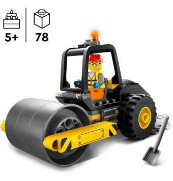 Equipada con unos enormes y gruesos neumáticos y un gran rodillo compactador. Con cabina del conductor y luz de advertencia, así como una minifigura de un obrero de la construcción con una pala y un casco