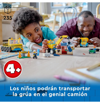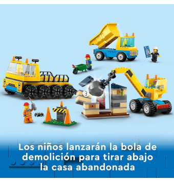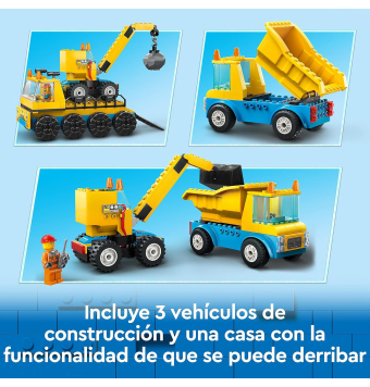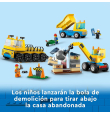 Incluye una grúa con bola de demolición, una casa abandonada y en ruinas, un camión de transporte de juguete, un volquete, 3