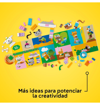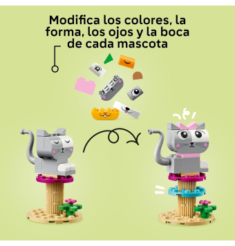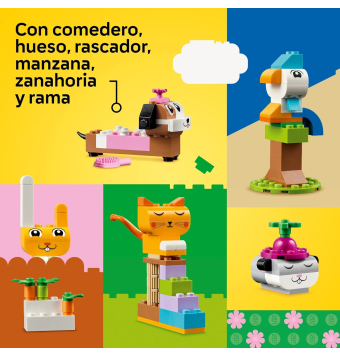 Tu peque construye y personaliza un perro, un gato, un hámster, un pájaro y un conejo usando ladrillos, ojos, bocas, colores y