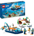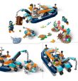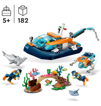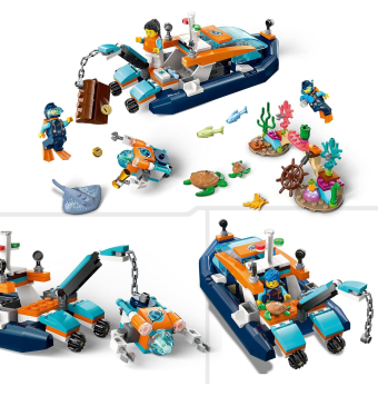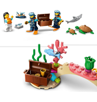 Este Lego City incluye 3 minifiguras: el capitán del barco y dos buzos LEGO, y las figuras animales de una manta raya, un tiburón martillo, un cangrejo, 2 peces y 2 tortugas para nadar con ellas