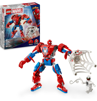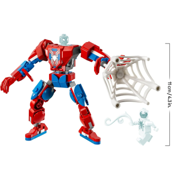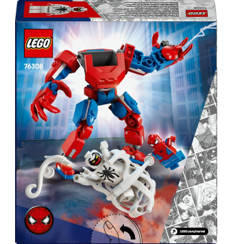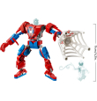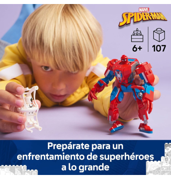 La armadura robótica tiene brazos, piernas y dedos móviles. El torso se abre y hay una cabina con espacio para la minifigura de Spider-Man.