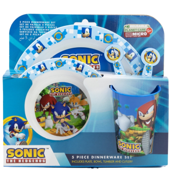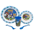 Set vajilla infantil de Sonic reutilizable apta para microondas compuesta por vaso, plato, cuenco y cubiertos.