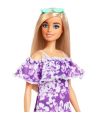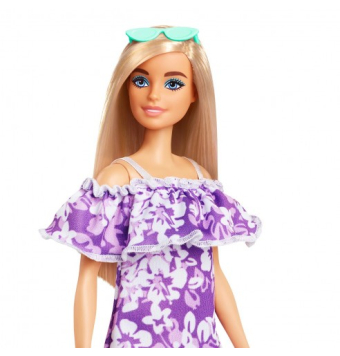 Esta muñeca Barbie marca tendencia con un vestido de volantes y estampado de flores, y modernas gafas de sol, todo elaborado a partir de plástico reciclado.