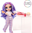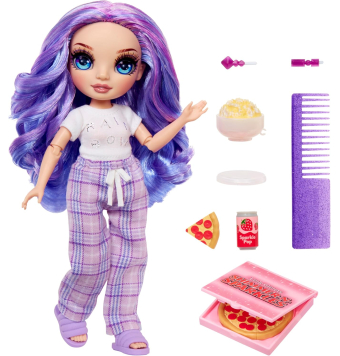 Cada amiga Rainbow aporta su actividad a la PJ Party; Violet trae comida deliciosa como una pizza en caja, palomitas de maíz, un plato y refresco