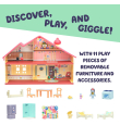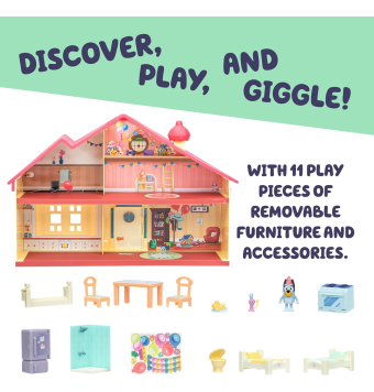 La Casa de celebraciones de Bluey. Celebra con Bluey. Con 11 accesorios y muebles quita y pon, más 1 figura exclusiva de Bluey de 6,3 cm. ¡Los peques pueden decorar la casa para la fiesta con la hoja de pegatinas incluida!