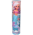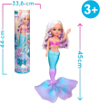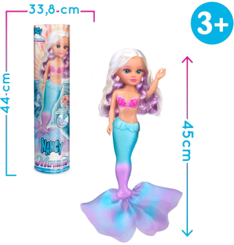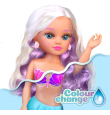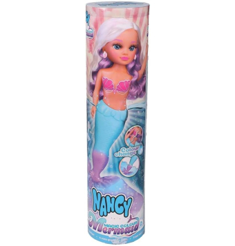 Nancy Magic Colour Mermaid, Muñeca 100% Sirena, Cola y Bikini Cambian de Color con el Agua, Melena Rubia con Mechas Moradas y Pendientes en Forma de Concha.