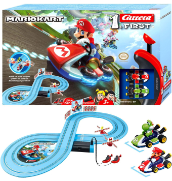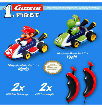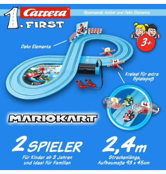 Entrega: 1 circuito Carrera FIRST Nintendo Mario Kart, 2 maquetas de coche y 2 palancas de mando ergonómicas incluidas, funciona con pilas, escala del 1 al 50, ideal para llevar