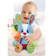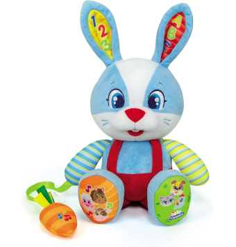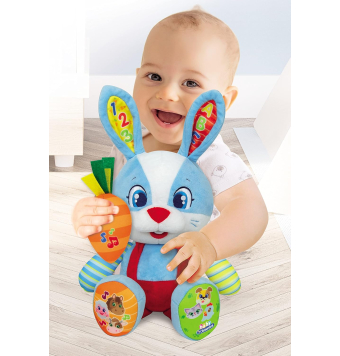primeras letras, los números y las palabras y versos de animales, gracias a los botones interactivos de las orejas y las patas del conejito.