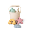 Cubo y pala y 4 figuras. Todo de silicona alimentaria y con una bolsa de red ideas para "sacudir" arena.