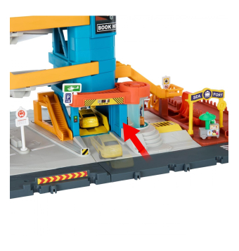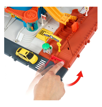 Este increíble centro cuenta con un parking de cinco niveles, un ascensor y puertas activables, ofreciendo horas de diversión y espacio para almacenar hasta 12 vehículos a escala 1:64.